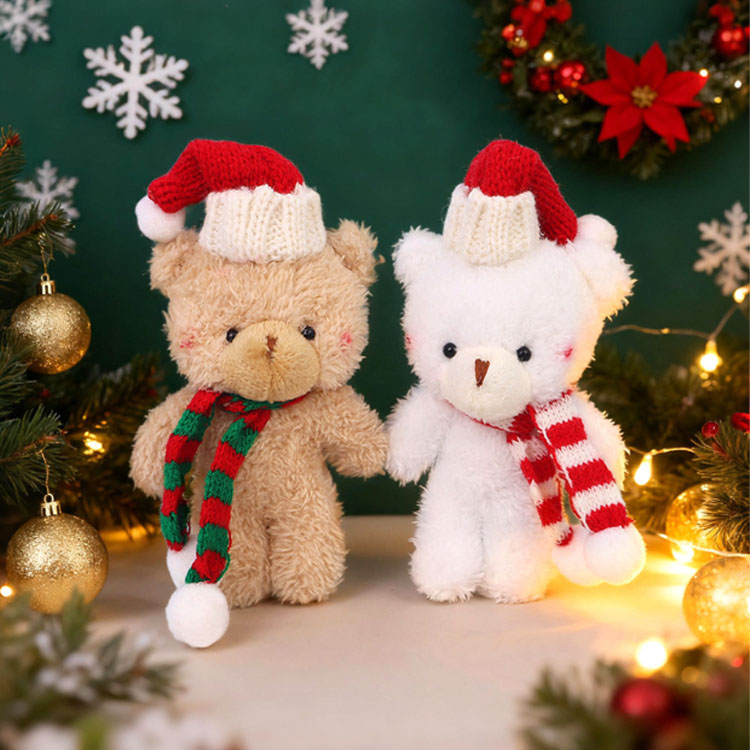 Tämä joulun täytetty lelu on nallekarhun muodossa, siinä on kaksi erilaista materiaalia, nimittäin muhkeat ja napafleece. Teddy -fleecen turkki on hieman kihara. Molemmilla materiaaleilla on sileä ja pehmeä rakenne ja ne ovat erittäin kevyitä. Teddy -fleece -karhu on kaksi väriä: vaaleanruskea ja tummanruskea. Pehmokarhulla on myös kaksi väriä: ruskea ja valkoinen. Jokainen karhu on pariksi erilaisella huivilla, ja jokaisella karhulla on punainen jouluhattu, mikä lisää juhlallisen kosketuksen. Karhun huivit ja hatut on neulottu ja ne on koristeltu valkoisilla pompomeilla, jotka näyttävät erittäin herkiltä. Karhun silmät ovat mustia, ja sen posket on täynnä punastua, joten se on erittäin söpö. Sen ulkonäkö on voittanut monien asiakkaiden rakkauden.