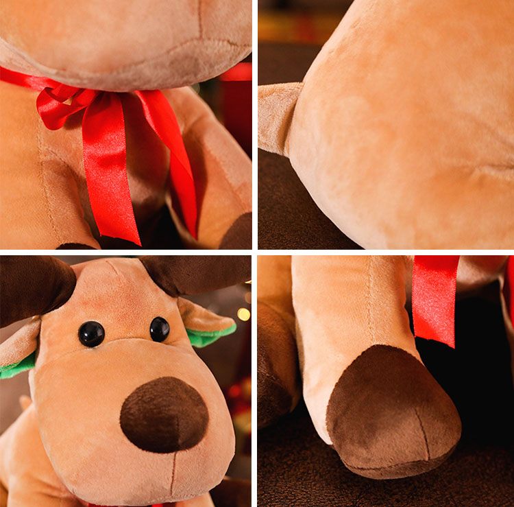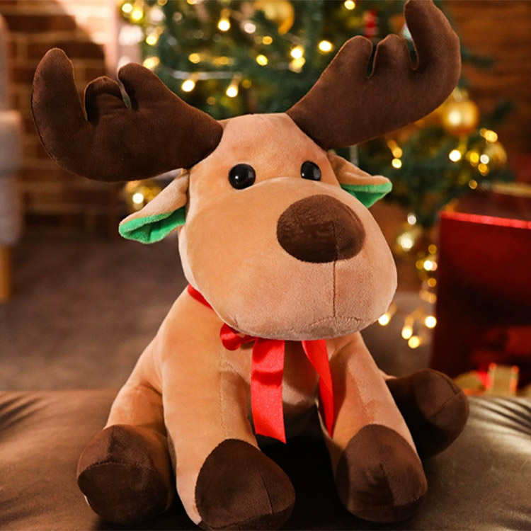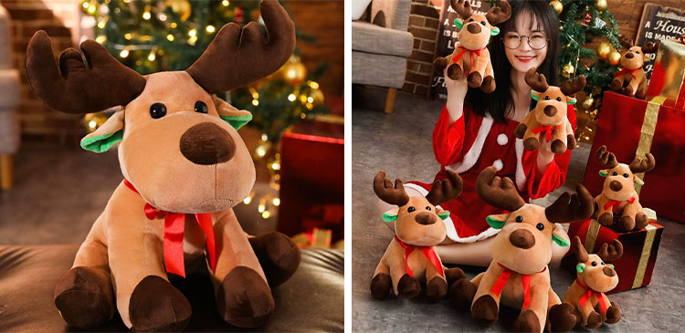 Tämä poron muhkeat lelu on erittäin lämpimässä vaaleanruskeassa. Pari sen päähän ovat erittäin söpöjä ja liioiteltuja. Sen pyöreät mustat silmät, tummanruskea nenä ja korvien sisällä olevat vihreät aksentit antavat sille tyylikkään ja kolmiulotteisen ilmeen. Kaulaansa sidottu kirkkaan punainen jousi lisää juhlava ilmapiiri. Tämän pienen peuran pehmeä ulkonäkö saa heti tunteen iloiseksi lomakauden aikana, ikään kuin se voisi tuoda sinulle lahjan milloin tahansa.