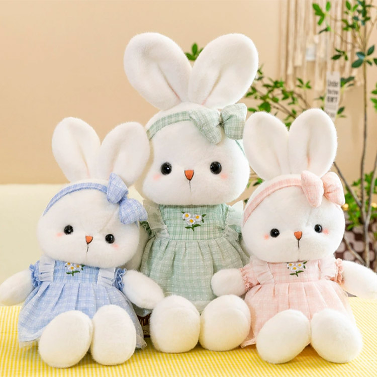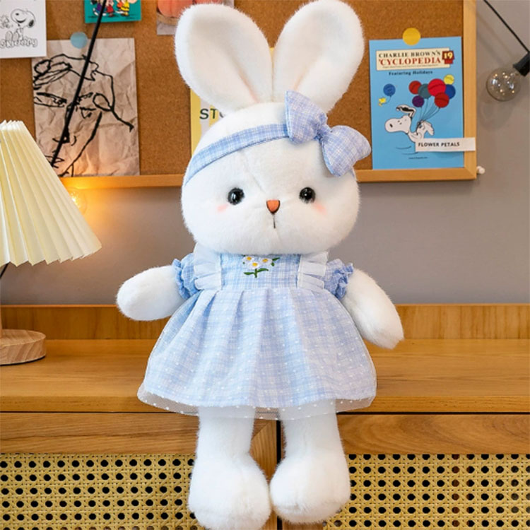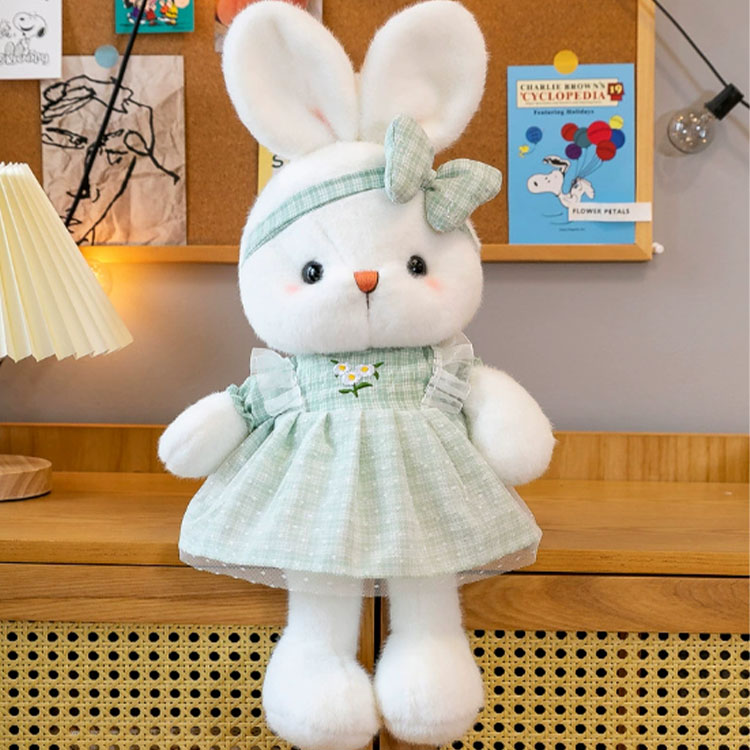 Tällä täytetyllä pääsiäispupulla on kolme eri värillistä mekkoa, nimittäin sininen, vihreä ja vaaleanpunainen. Mekot ovat erittäin kauniita ja ammattitaito on erittäin hieno. Niitä on myös brodeerattuja kukkia. Mekkojen reunat on koristeltu pitsillä, mikä on erittäin hieno. Mukavien mekkojen lisäksi kanien päissä on myös jousia koristeina, ja värit ovat sovitettu pukeutuneisiin mekkoihin. Tämän täytetyn pääsiäisen kanin kasvot ovat pyöreät ja erittäin söpöt. Nenä on valmistettu kirjonnasta, ja suu on kiinnitetty nenän alle. Posket ovat vaaleanpunaisia ja erittäin rakastettavia. Näyttää siltä, että tämä pieni kani on vähän ujo, mutta samalla se voi tuoda erittäin lämpimän tunteen. Tätä kania on kolme kokoa, nimittäin 40 senttimetriä, 50 senttimetriä ja 60 senttimetriä. Voit valita tarvitsemasi koon. Tämä pieni kani on erinomainen valinta, olipa se sitten koristelu tai lomalahja.